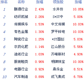 盤面上看,白酒、機(jī)器人、葡萄酒、養(yǎng)老概念漲幅居前。天津自貿(mào)區(qū)、鈦白粉、石墨烯概念跌幅靠前。截止午間收盤,滬指報(bào)2032.38,漲幅0.4%;深成指報(bào)7231.63,漲幅0.54%;創(chuàng)業(yè)板指報(bào)1369.16,漲幅0.58%。