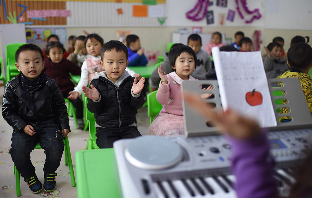 3月22日,青海省黃南藏族自治州幼兒園小班學生在上音樂課。 從2016年春季學期開始,青海省在海北、海南、黃南、果洛、玉樹五個藏族自治州及海西蒙古族藏族自治州實行包括學前三年、義務教育九年、高中及中職三年的15年免費教育,西寧市、海東市的貧困家庭學生也享受上述政策,首批惠及學生86.1萬名。 “十三五”期間,青海省還將以擴大教育資源、促進教育公平為重點,加快廣大牧區雙語幼兒園建設,同時進一步優化中小學布局結構。新華社記者 張宏祥 攝 -