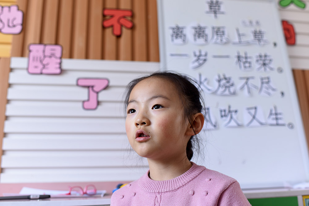 3月22日,青海省黃南藏族自治州幼兒園大班學生王雨馨在背誦古詩。 從2016年春季學期開始,青海省在海北、海南、黃南、果洛、玉樹五個藏族自治州及海西蒙古族藏族自治州實行包括學前三年、義務教育九年、高中及中職三年的15年免費教育,西寧市、海東市的貧困家庭學生也享受上述政策,首批惠及學生86.1萬名。 “十三五”期間,青海省還將以擴大教育資源、促進教育公平為重點,加快廣大牧區雙語幼兒園建設,同時進一步優化中小學布局結構。新華社記者 張宏祥 攝 -