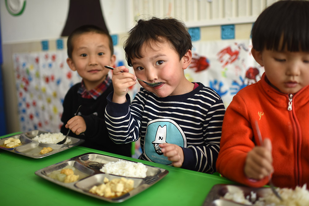 3月22日,青海省黃南藏族自治州幼兒園小班學生多杰卓瑪(中)在吃午餐。 從2016年春季學期開始,青海省在海北、海南、黃南、果洛、玉樹五個藏族自治州及海西蒙古族藏族自治州實行包括學前三年、義務教育九年、高中及中職三年的15年免費教育,西寧市、海東市的貧困家庭學生也享受上述政策,首批惠及學生86.1萬名。 “十三五”期間,青海省還將以擴大教育資源、促進教育公平為重點,加快廣大牧區雙語幼兒園建設,同時進一步優化中小學布局結構。新華社記者 張宏祥 攝 -