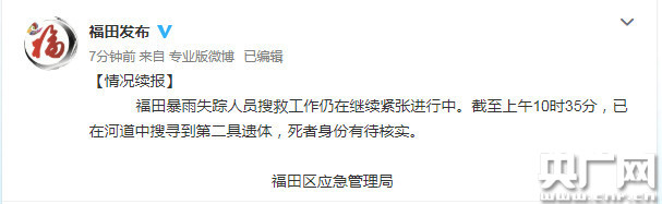 央廣網深圳4月12日消息(記者李強 鄭柱子)2019年4月11日晚,深圳市瞬時強降雨引發洪水,到目前為止,死亡人數增至6人,相關救援工作仍在緊張進行。