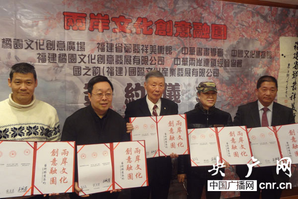 在臺(tái)北舉辦聯(lián)合簽約的有兩岸十多家文化產(chǎn)業(yè)單位和團(tuán)體,包括:福建橘園文化創(chuàng)意廣場、福建省鄭發(fā)祥美術(shù)館、國之韻(福建)國際文化產(chǎn)業(yè)發(fā)展有限公司、福建橘園文化創(chuàng)意發(fā)展有限公司、臺(tái)灣中國文化統(tǒng)一促進(jìn)會(huì)、臺(tái)灣中國文化博物館、臺(tái)灣中華書畫學(xué)會(huì)、中華兩岸連鎖經(jīng)營協(xié)會(huì)、臺(tái)灣海峽兩岸文教經(jīng)貿(mào)交流協(xié)會(huì)、臺(tái)灣中華微型創(chuàng)意協(xié)會(huì)等。它們將共同組成兩岸文化聯(lián)盟,為加強(qiáng)海峽兩岸文化創(chuàng)意的交流譜寫新的樂章。