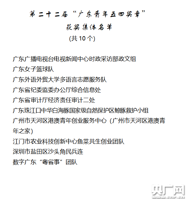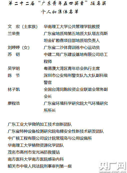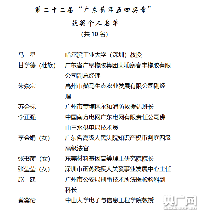 央廣網廣州4月29日消息(記者鄭澍 通訊員岳青)4月29日,第二十二屆“廣東青年五四獎章”評選揭曉,馬星等10名同志、廣州市天河區港澳青年創業服務中心(廣州市天河區港澳青年之家)等10個集體獲獎。