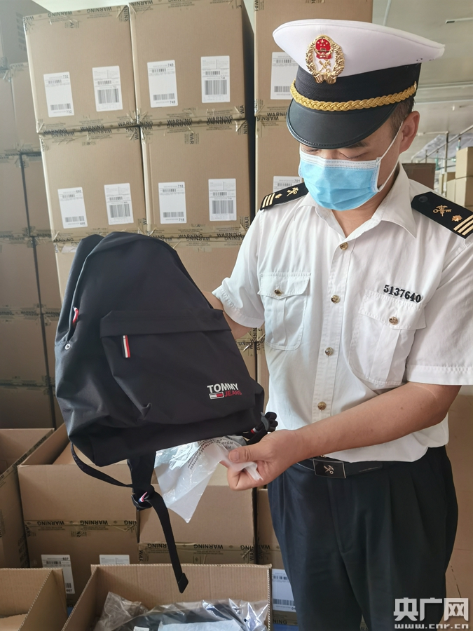 △廣州海關所屬荔灣海關關員對以市場采購貿易方式的出口箱包進行檢疫監管(央廣網發 海關供圖)