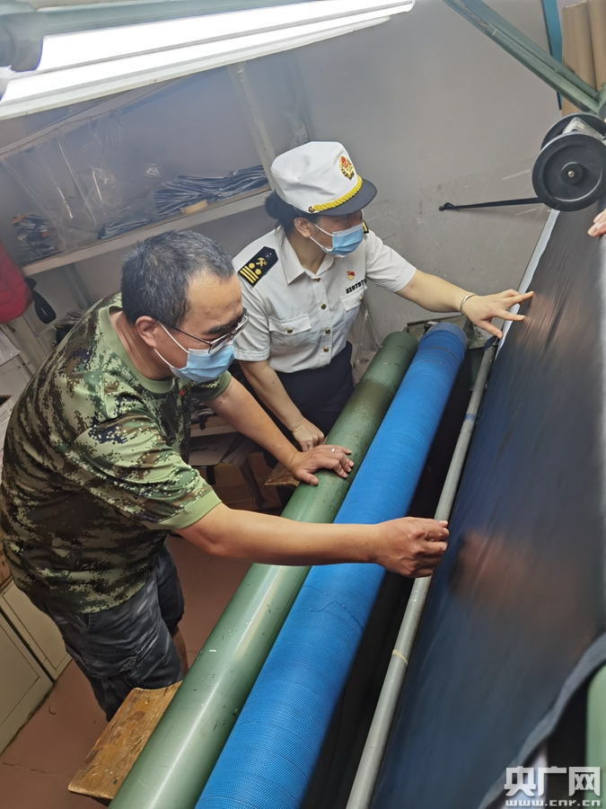 △廣州海關所屬荔灣海關關員對市場采購試點企業生產箱包所用的頭層牛皮進行檢疫監管(央廣網發 海關供圖)
