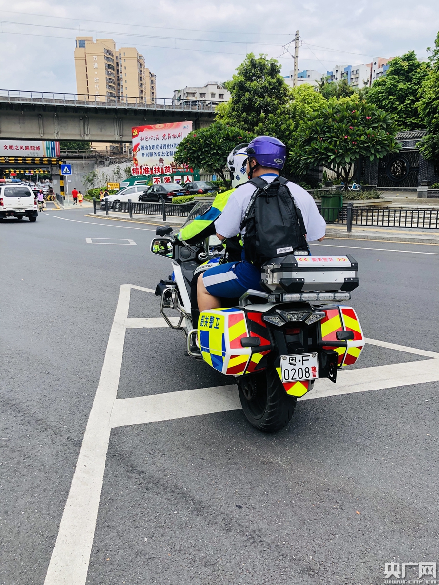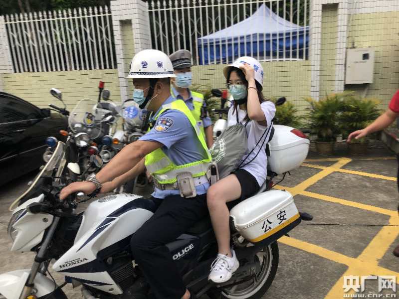 7月8日上午,江門新會葵城中學考點,執勤民警駕駛警用摩托車搭載一忘記攜帶身份證考生取身份證。(央廣網發 江門公安供圖)