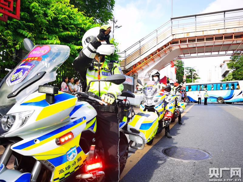 7月7日上午,東莞高埗鐵騎在護送考生到達考場后揮手為考生加油鼓勁。(央廣網發 管萱萱 攝)