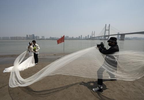 4月12日,一對新人在武漢江灘公園拍攝婚紗照。圖片來源 新華社