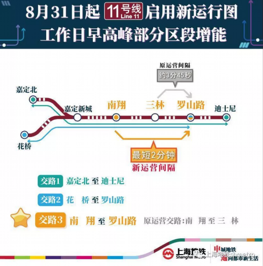 同時,11號線運行交路由原先的“南翔站~三林站/花橋站~羅山路站/嘉定北站~迪士尼站”調整為“南翔站~羅山路站/花橋站~羅山路站/嘉定北站~迪士尼站”。